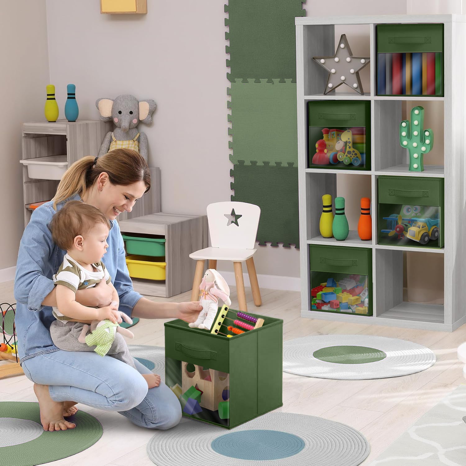 - Can be used in the nursery, playroom, kids’ room, family room, laundry area, closet, storage room, etc. Sit cubes on the floor, in the closet, bookcase, shelving area, cubbies or dorm room