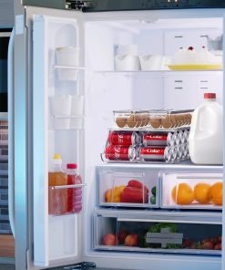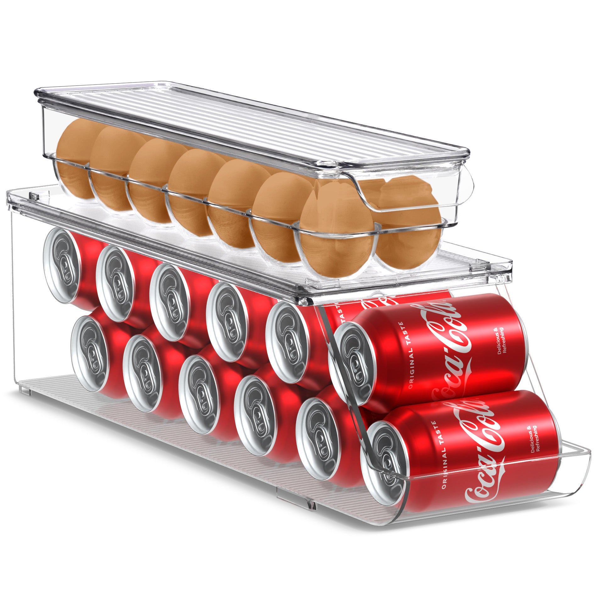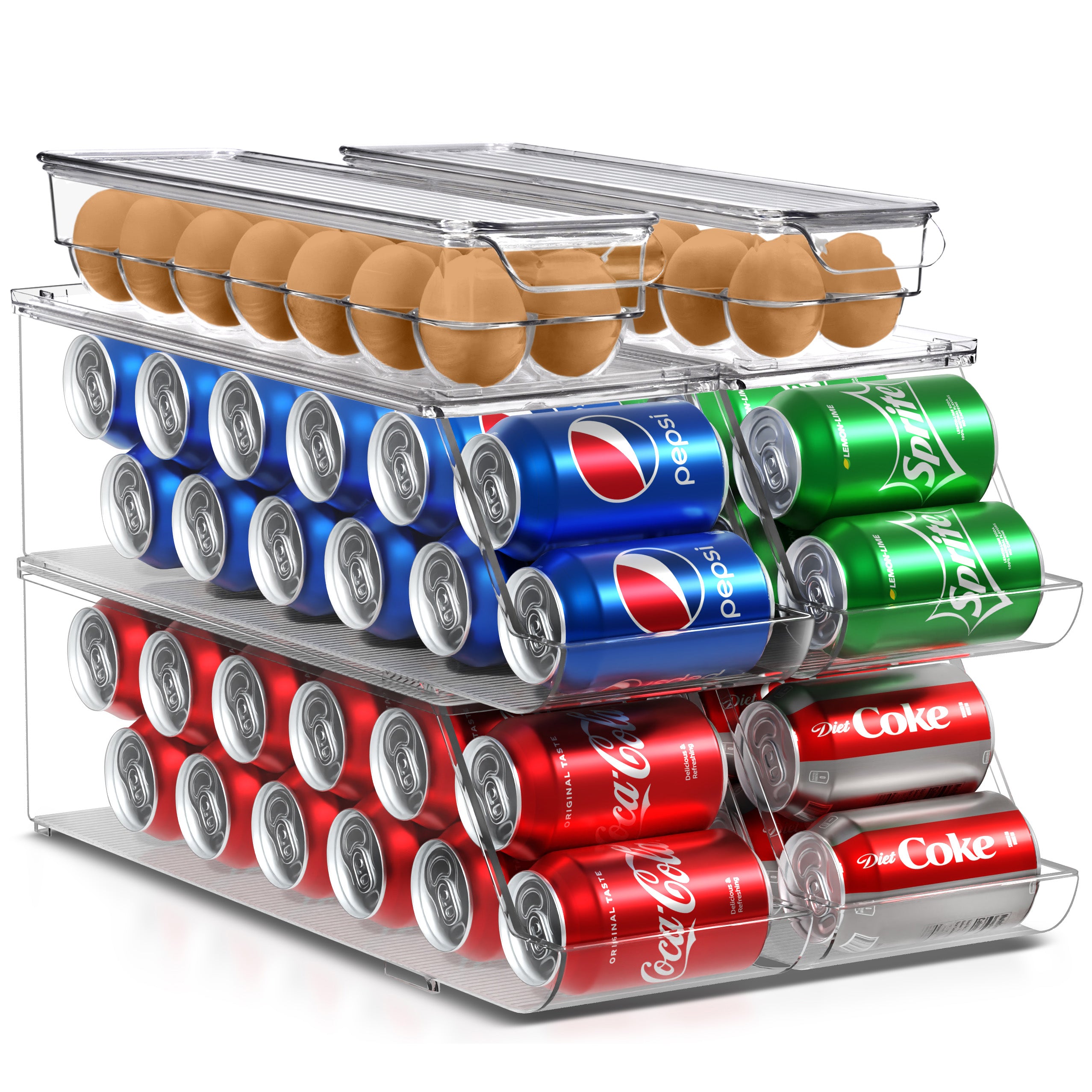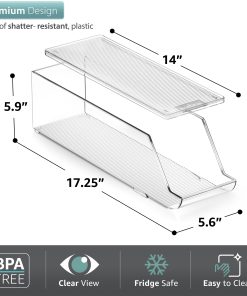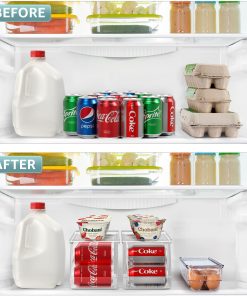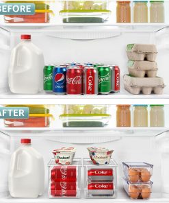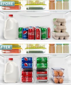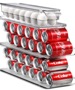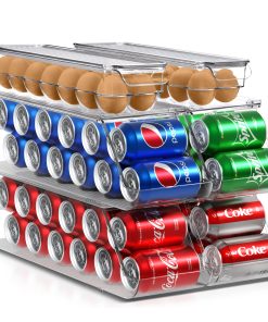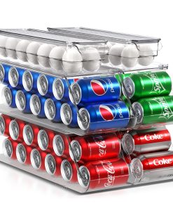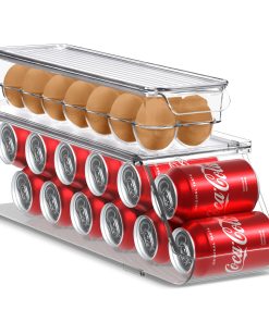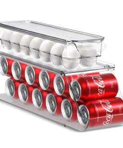 The Sorbus Soda Can Organizer + Egg Container Set is a convenient solution for refrigerator organization, featuring can organizers and egg organizers. The Soda Can Dispenser for Refrigerator stands out with its ability to hold up to 12 standard cans, rotating and sliding for easy access. The Plastic Egg Carton accommodates 14 eggs with a sturdy lid for stacking or placing items on top. Its versatile use includes serving as an egg tray, reusable egg carton, or egg storage. This set saves space in your refrigerator, eliminating clutter and disorganization without requiring any assembly or tools. The dimensions of the Can Dispenser for Fridge are 17.2″ L X 5.8″ H X 5.5″ W, while the Egg Holder measures 14.50″ L x 4.37″ W x 3.12″ H.