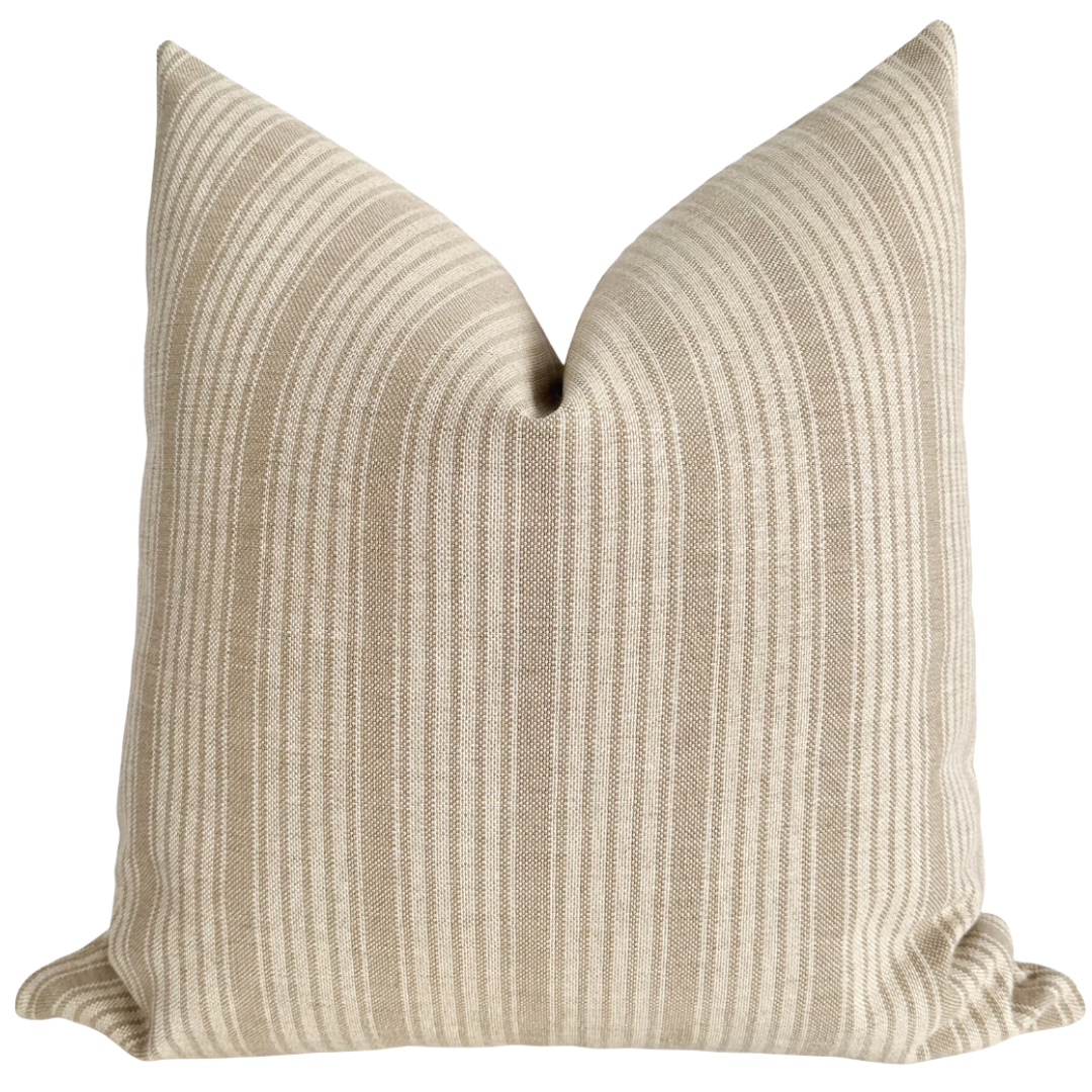 Refresh your space with the timeless beauty of the calming Chai Stripe brown pillow cover in a shade of tan and white. Inspired by simple elegance, this handmade decorative pillow cover features a sophisticated stripe design that brings luxury and serenity to your home.