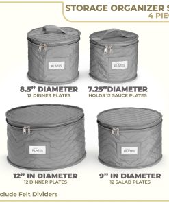 - Includes 12″ Dinner Plate Case (for up to 12 dinner plates), 9″ Salad Plate Case (for up to 12 salad plates), 8.5″ Dessert Plate Case (for up to 12 dessert plates), 7.25″ Saucer Plate Case (for up to 12 saucers)