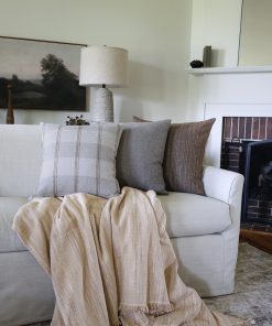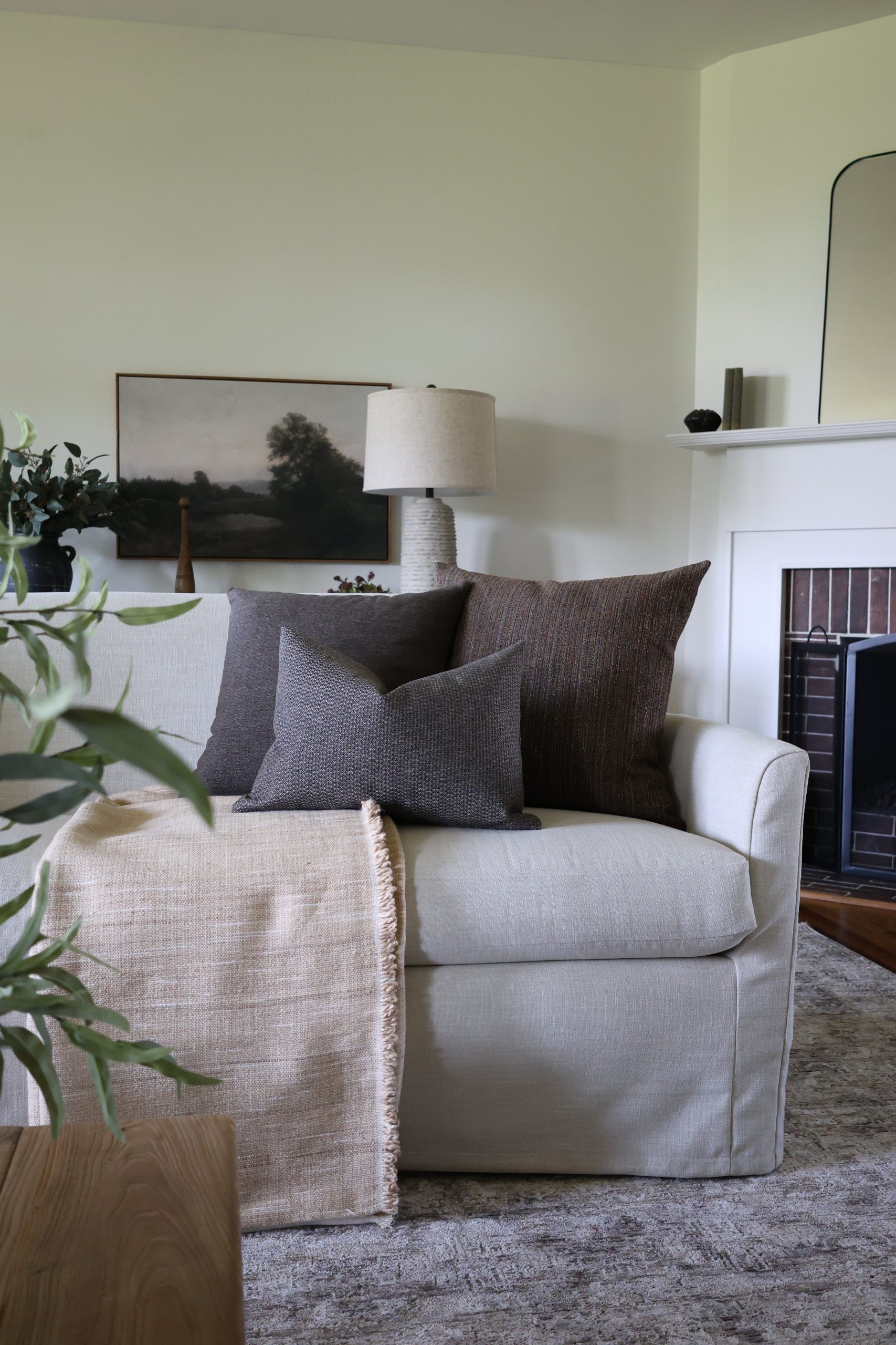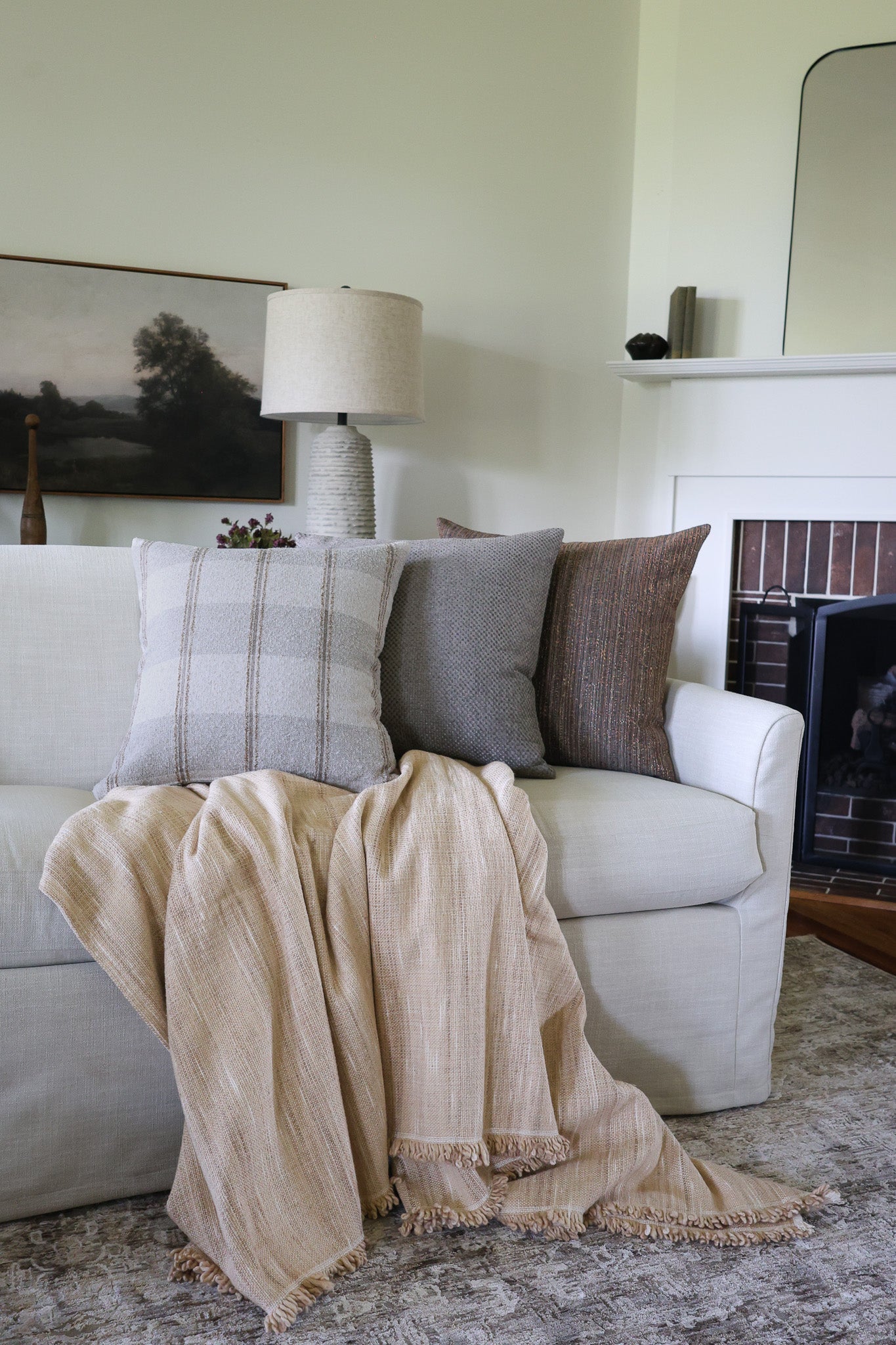 - Styled with pillow covers: Mesa Stripe | Wheat, Weft Weave | Gray, Casa Grande Mahogany