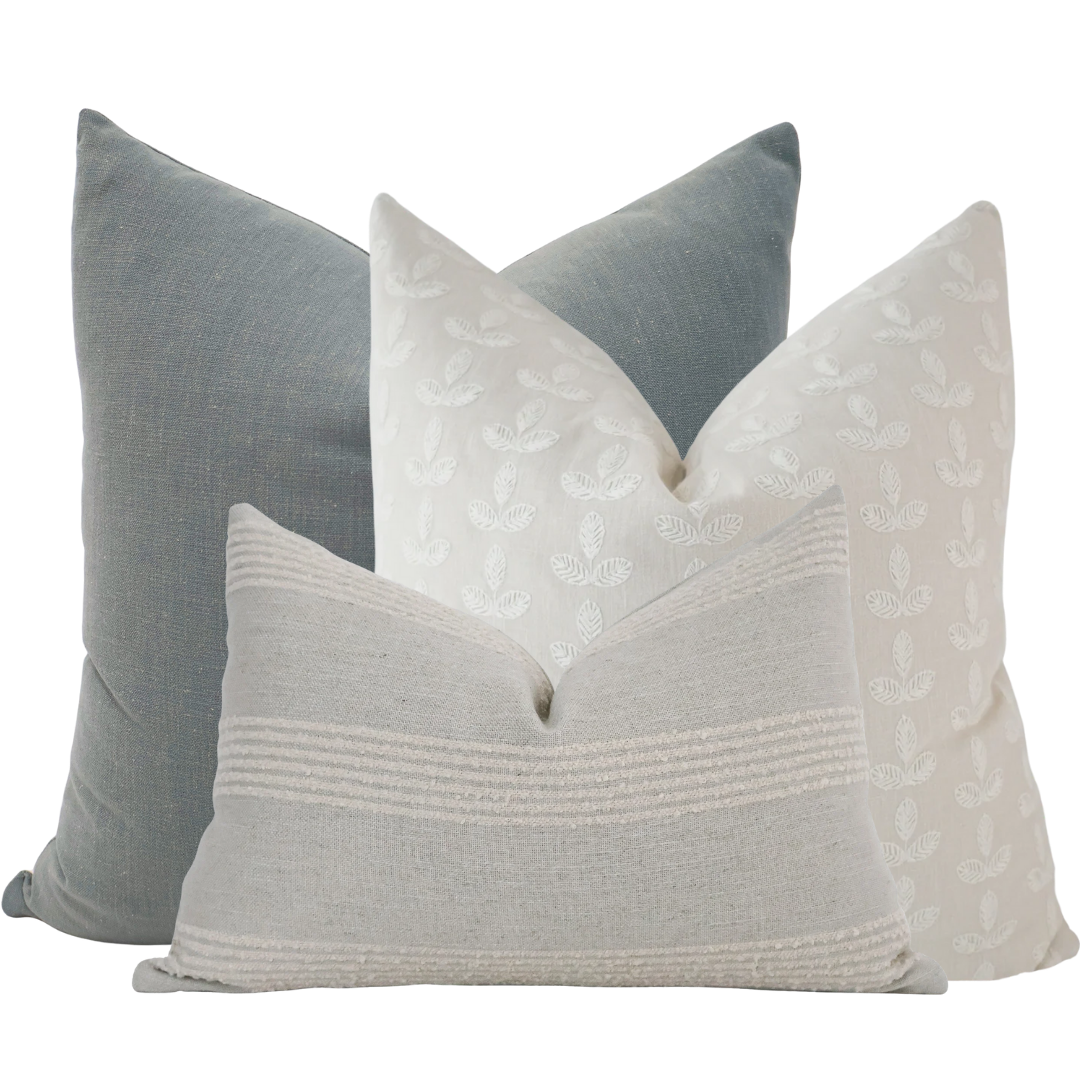 At the heart of the set is a pillow cover featuring a delicate embroidered stitched leaf motif, adding a handcrafted detail that feels organic and understated. Paired with a softly washed solid and a textured neutral lumbar, the combination creates depth without visual noise—perfect for spaces that lean into quiet luxury and intentional living.