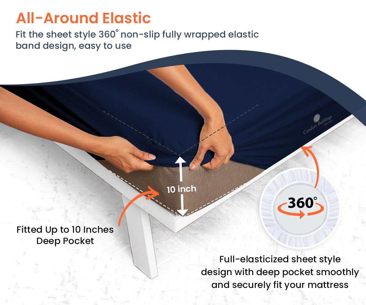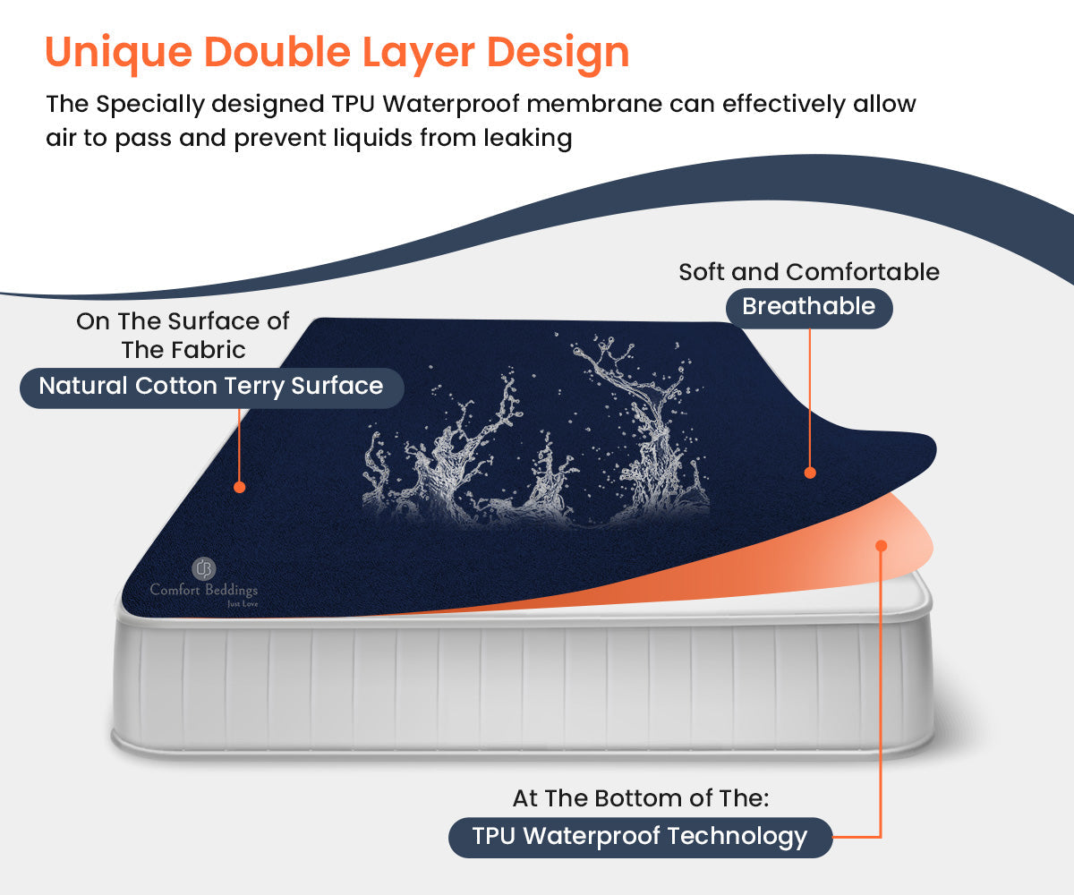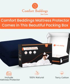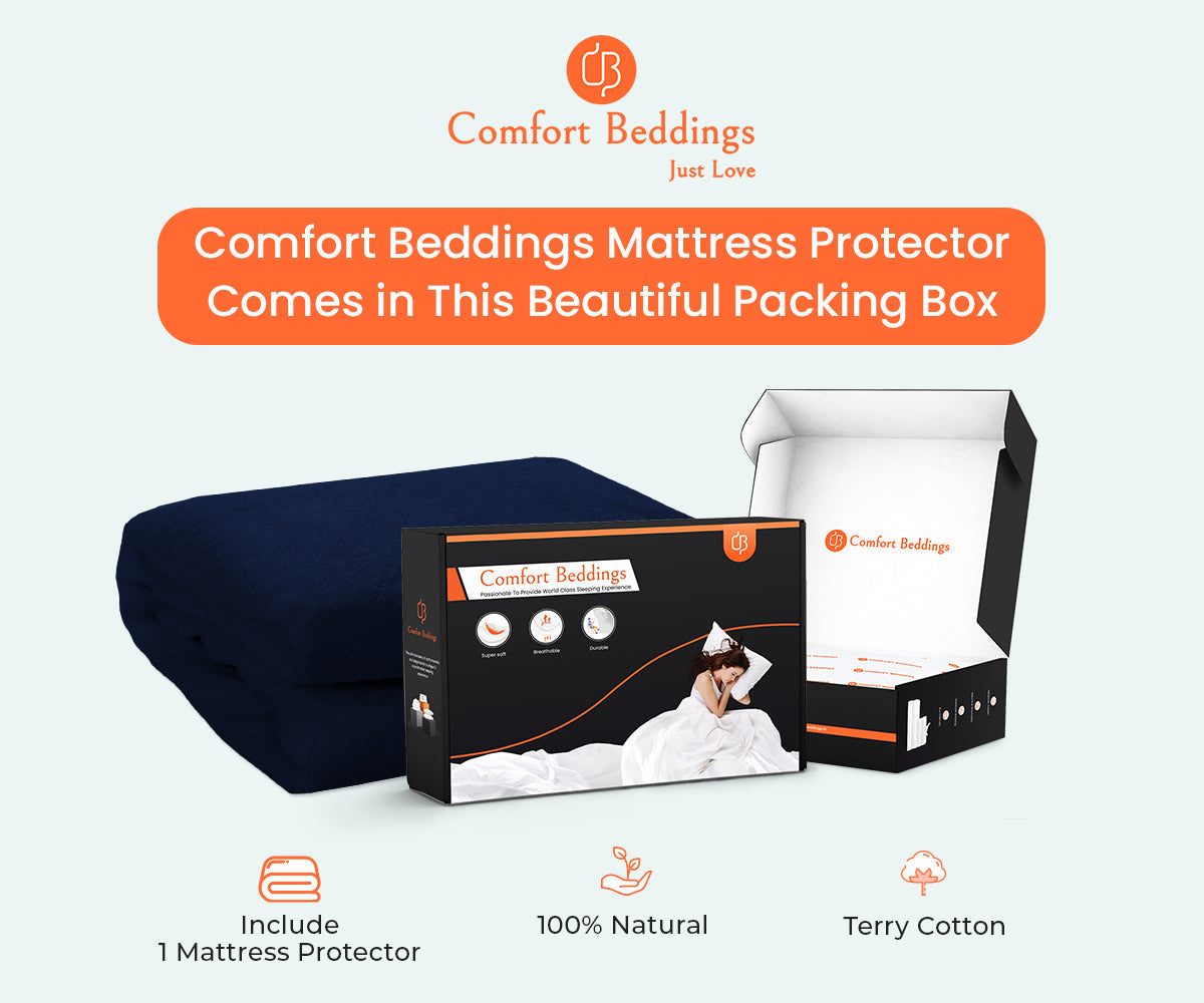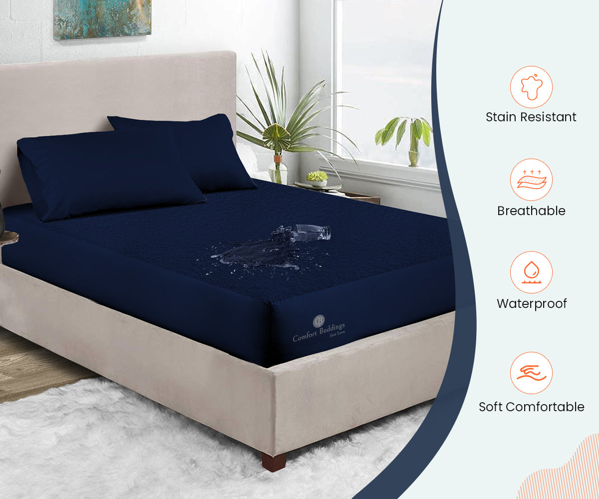 Comfort beddings Navy Blue Terry Mattress Protector gives you a soft hand. It gives protection against dust mites, bed bugs, bacteria, and other allergies. Our absorbent Terry Mattress Protector keeps the surface of your bed clean and comfortable. It extends the life of your mattress against spills, stains, fluids, and all types of liquids.
