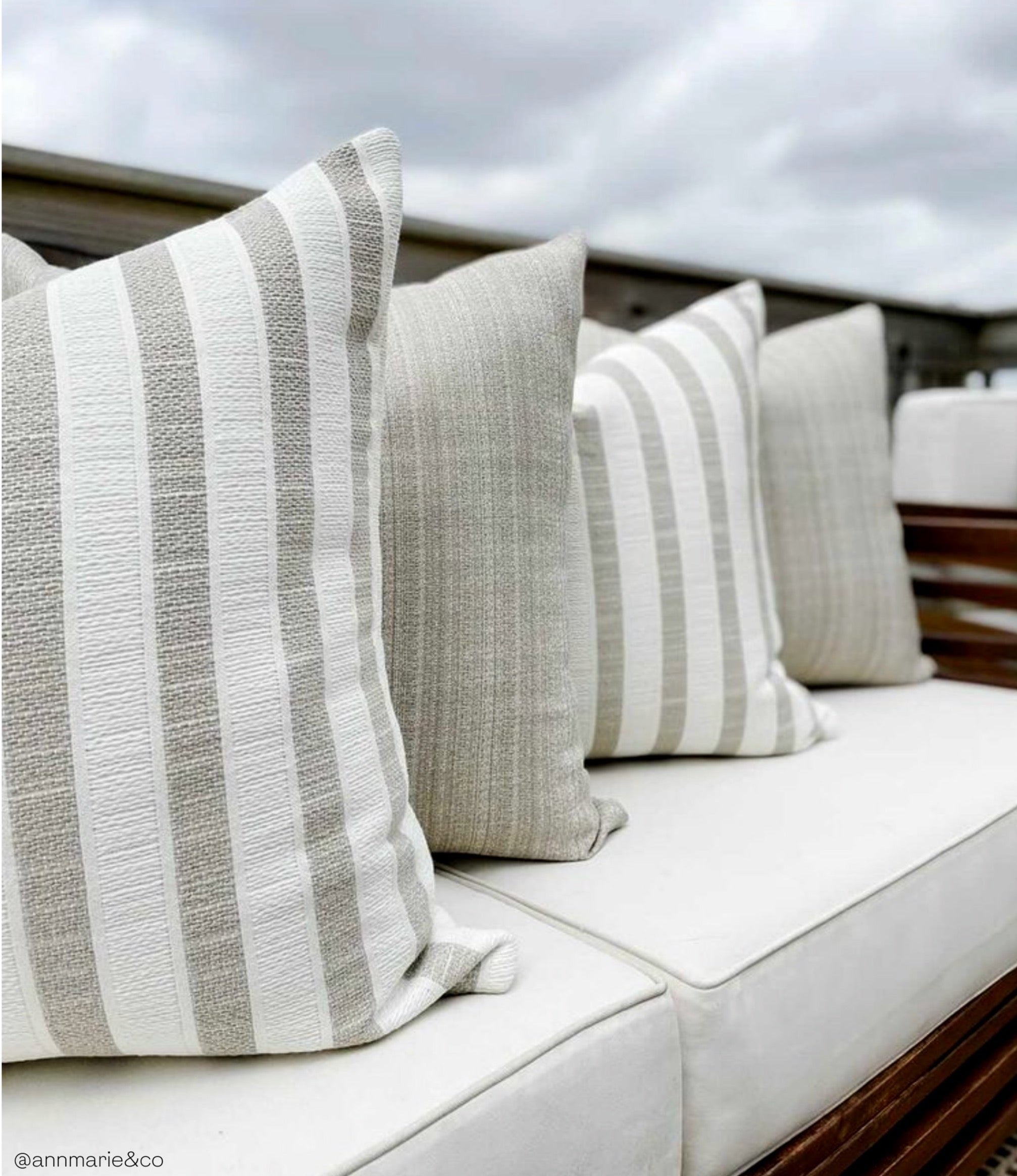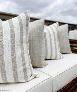 Hackner Home outdoor pillow covers are made from top-end fabrics designed for outdoor use. Styled by Jessica Hahn + Brittney Little of @AnnMarie&Co. Our Outdoor Woven Stripes pillow cover offers beautiful shades of sand and and warm white tones. This pillow cover is made in a durable outdoor fabric that will brighten your outdoor living space. Pair with our other outdoor pillow covers for a beautiful and comfortable outdoor look.