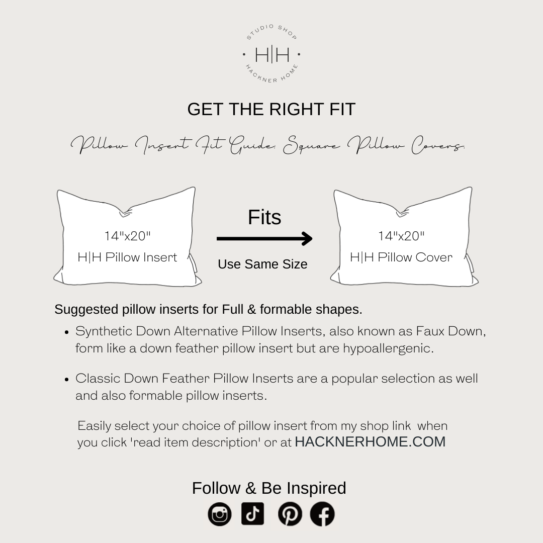 We use one size up insert from the pillow cover size for best full fit for square shapes. For example, for a pillow cover size 20″x20″ you will use a size 22″x22″ pillow insert for a full fitted look. Lumbar pillow inserts and covers fit best true to size. For example, use a 14″x20″ pillow cover with a 14″x20″ pillow insert.