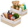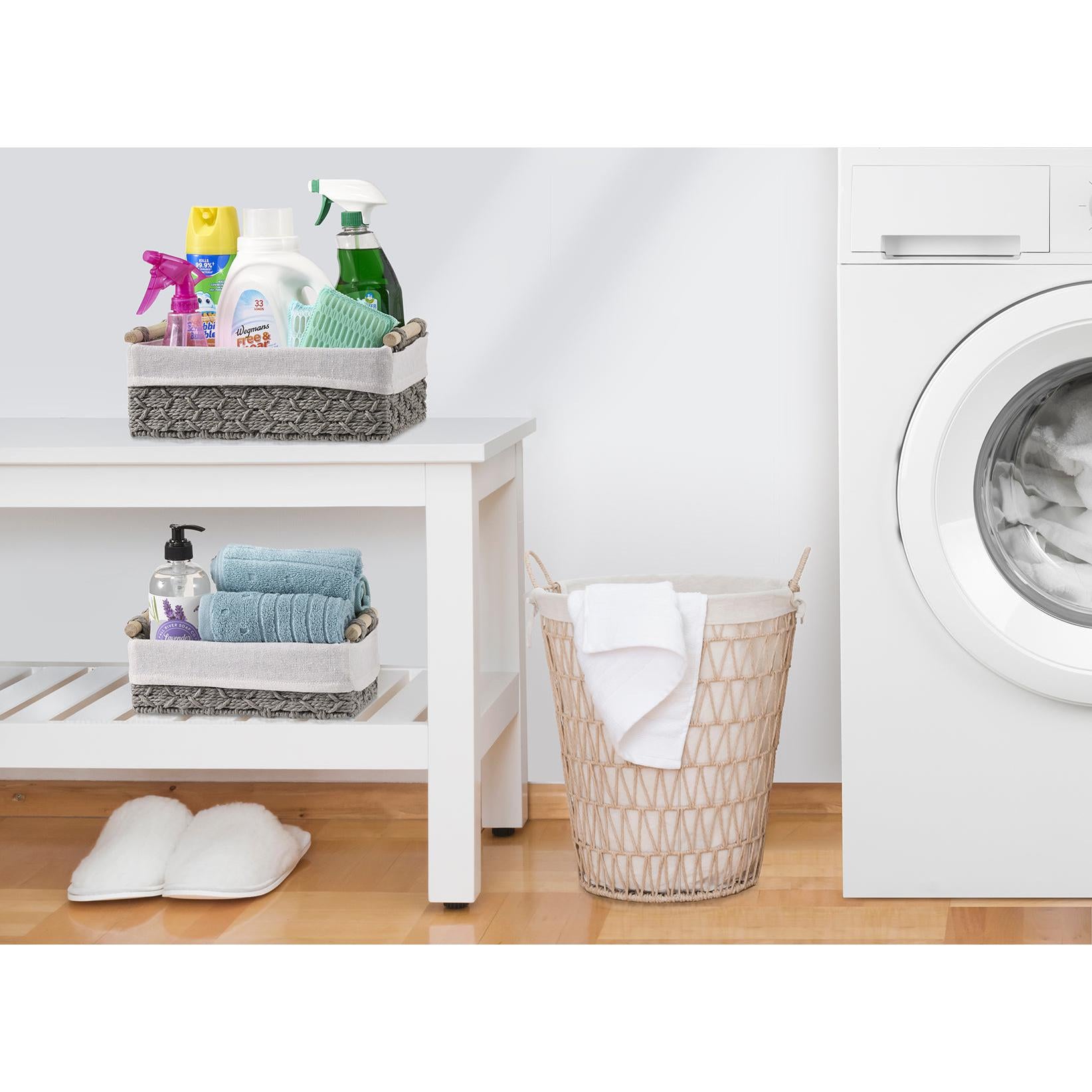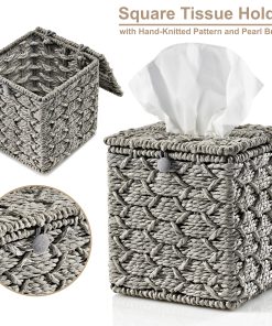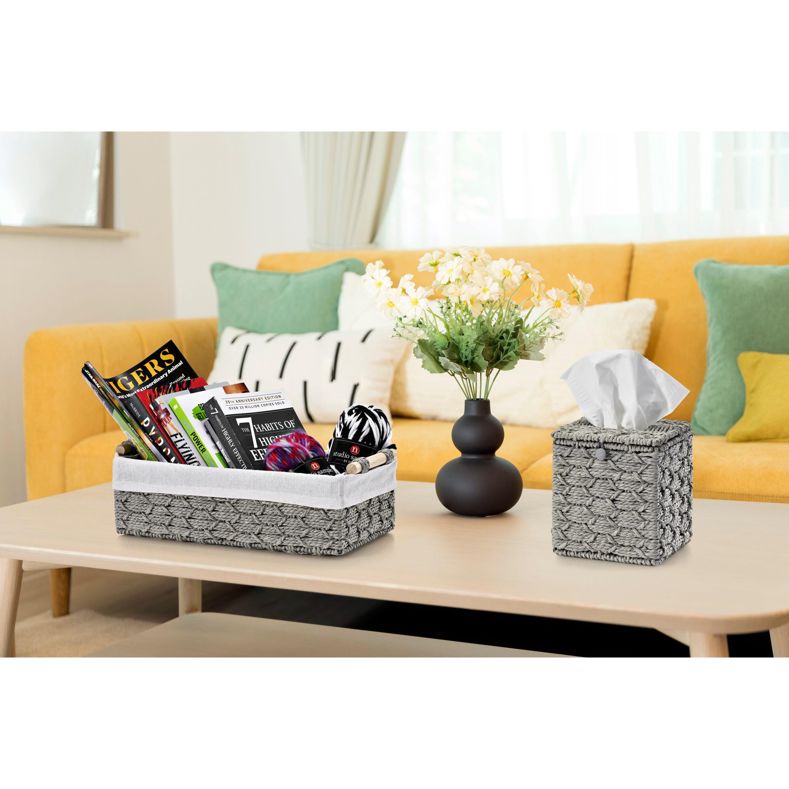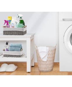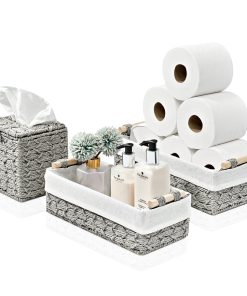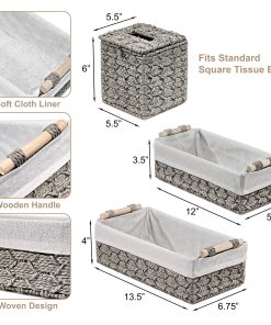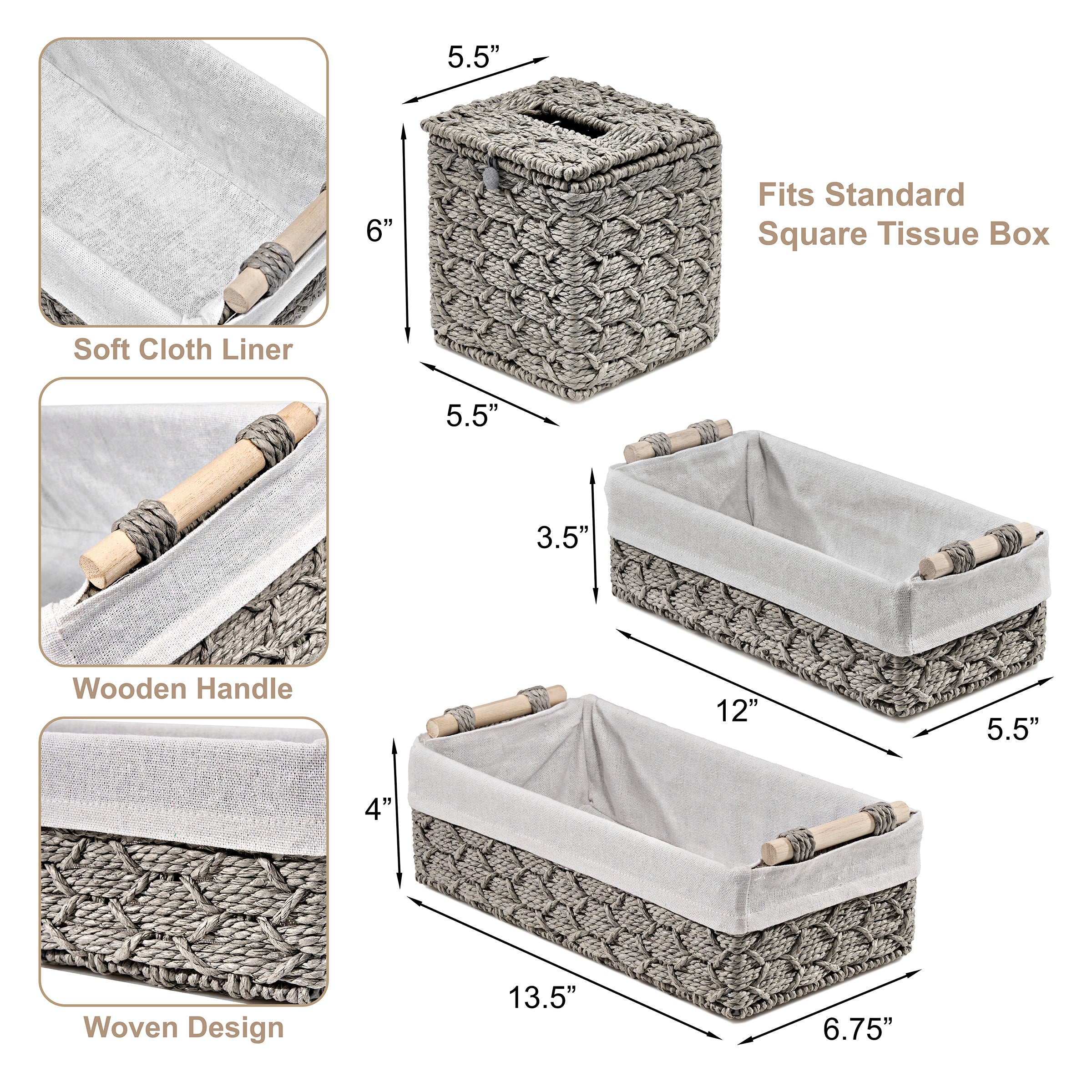 - Sorbus Paper Rope Bathroom Set: Each set includes two lined storage baskets and one tissue holder featuring a paper role material and bohemian design