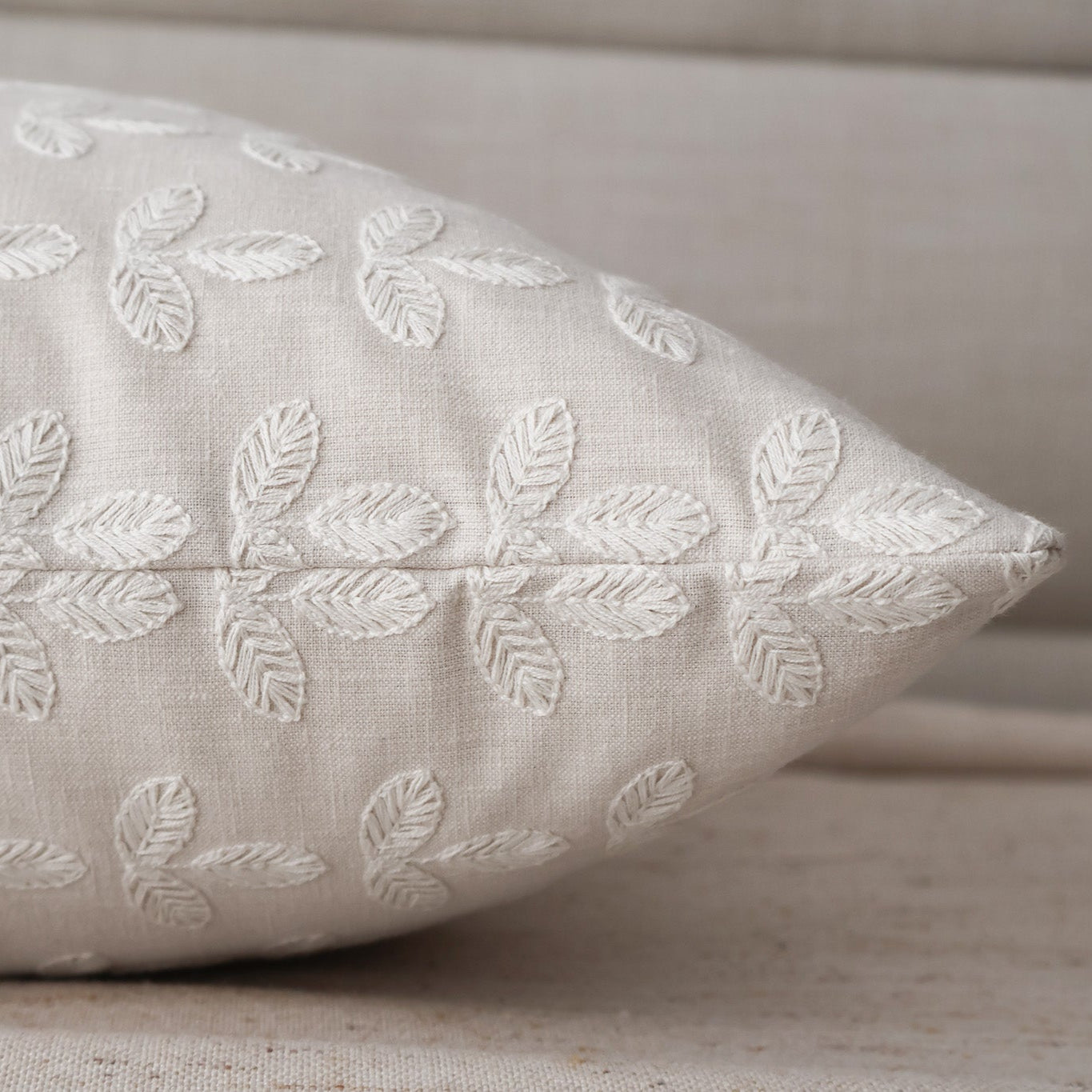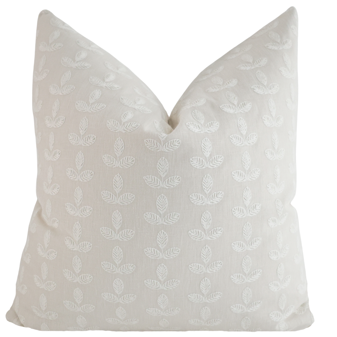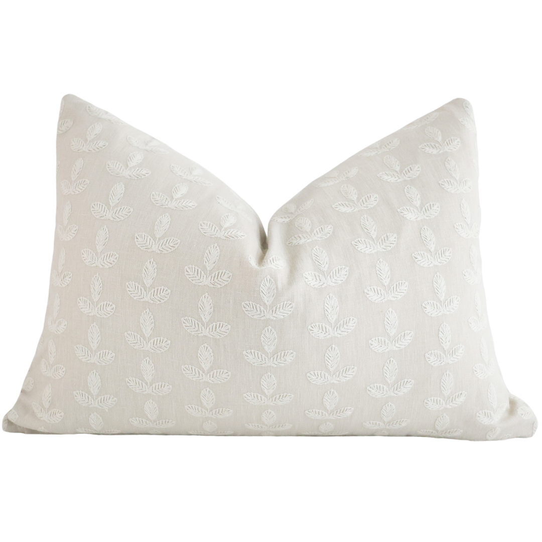 Add a touch of sophisticated charm to your home with this designer decorative pillow cover, crafted from a premium cotton with a linen fabric look in a soft, neutral hue. Featuring delicate white embroidered leaves, this pillow cover combines natural texture with intricate detailing, creating a high-end, artisan look that enhances any modern, farmhouse, or transitional décor.