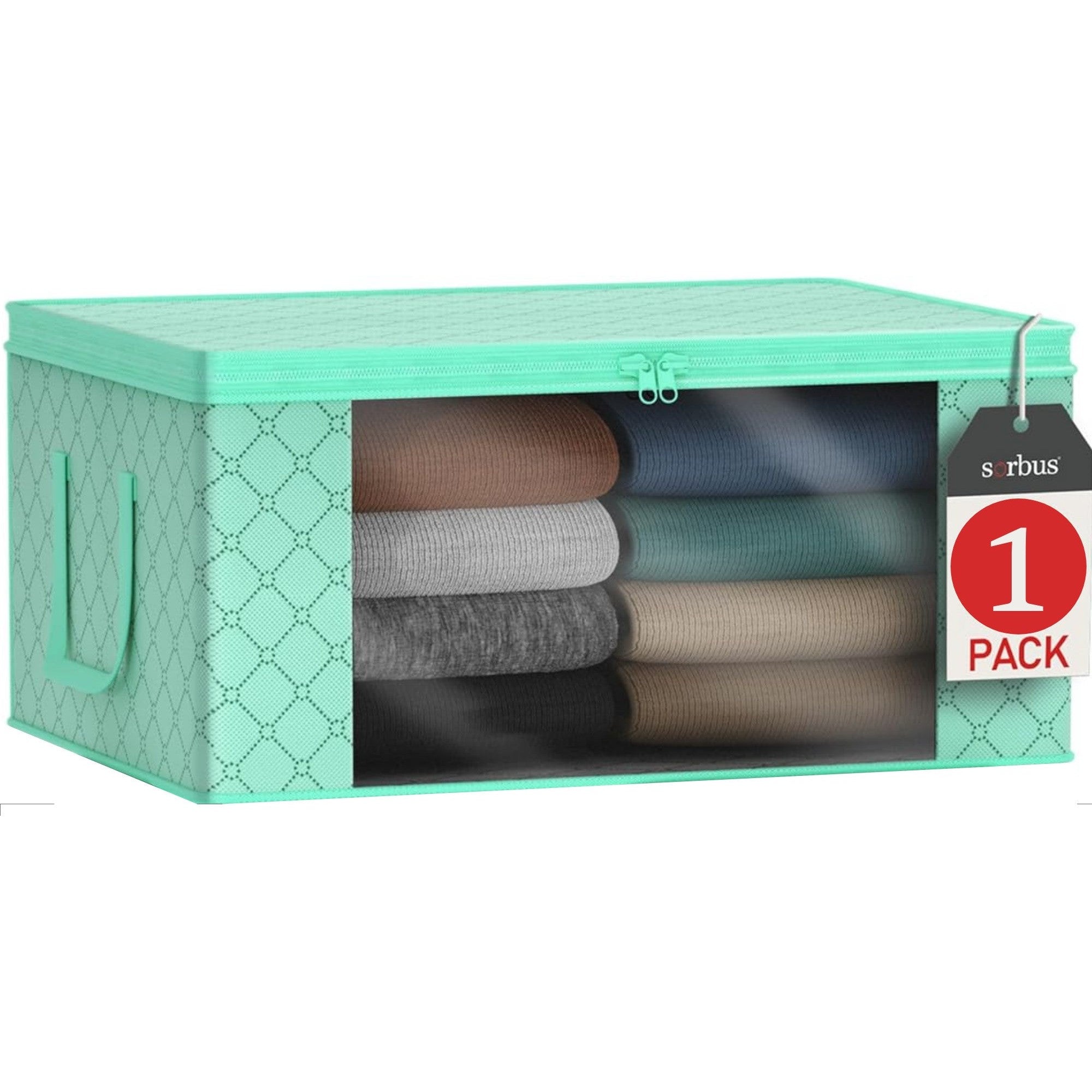 Pack, zip, and transport household essentials with a clear view! The Sorbus Storage Organizer Bag stores and protects your seasonal items and apparel. It features two carry handles and a large transparent front window to see contents at a glance. The generous size compartment provides plenty of room for clothing storage, blankets, linens, holiday decorations, toys, photos, baby clothes, or to use as saree bags. A fully zippered closure helps protect from dust, pests, and water damage while securing contents. For easy transport, the built-in carry handles make this bag portable and convenient. Once filled, it easily fits on shelves, stacks on top of each other, or slides under the bed to maximize space.
