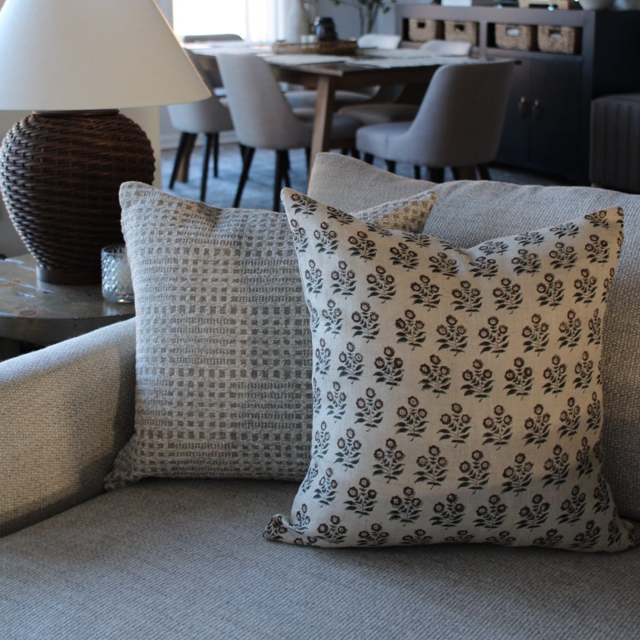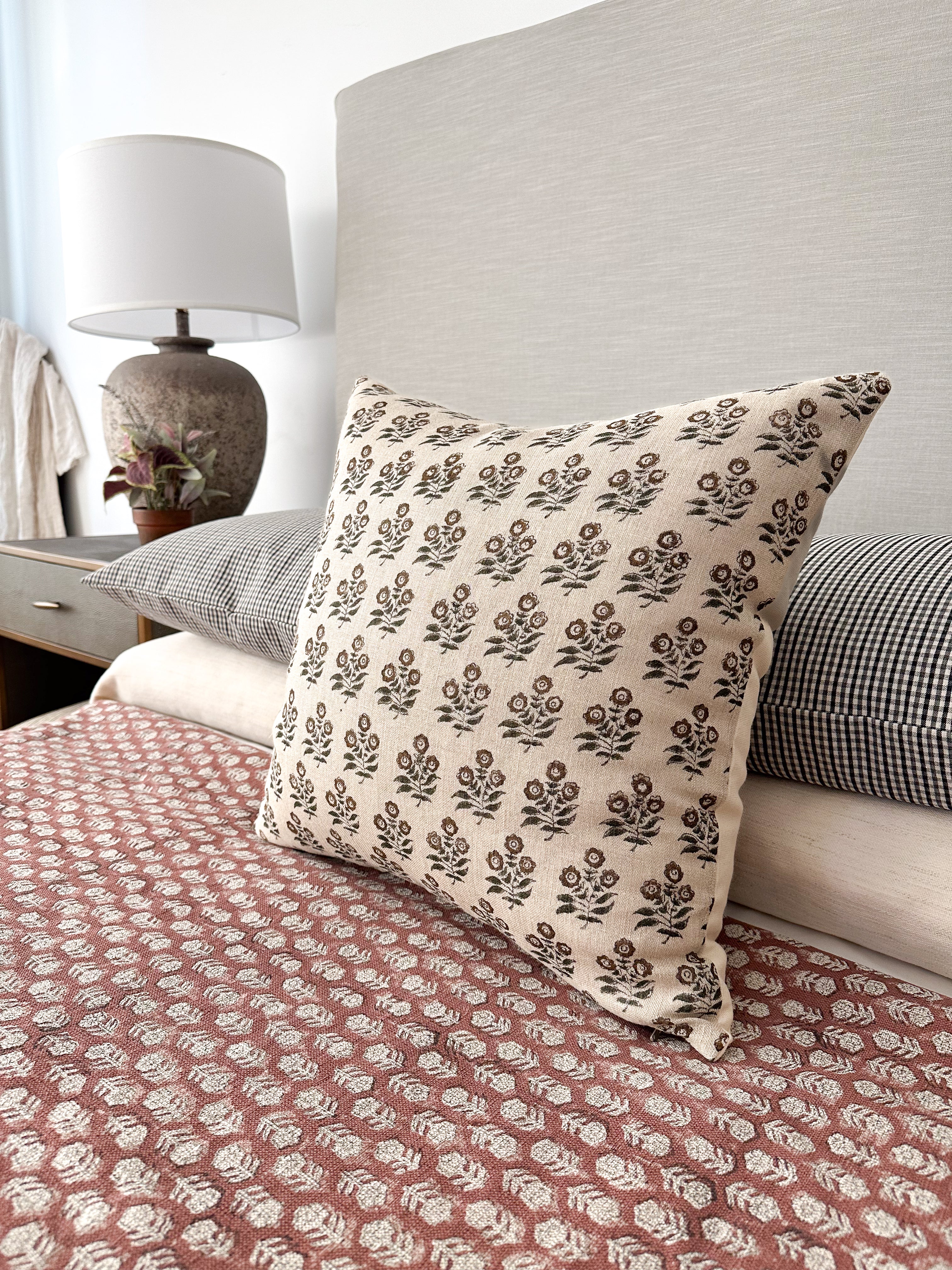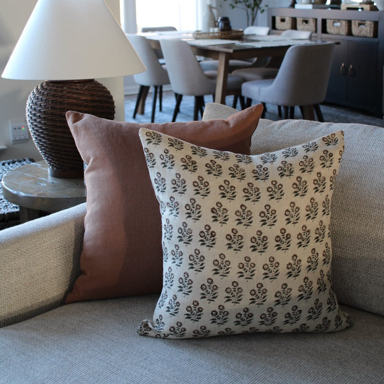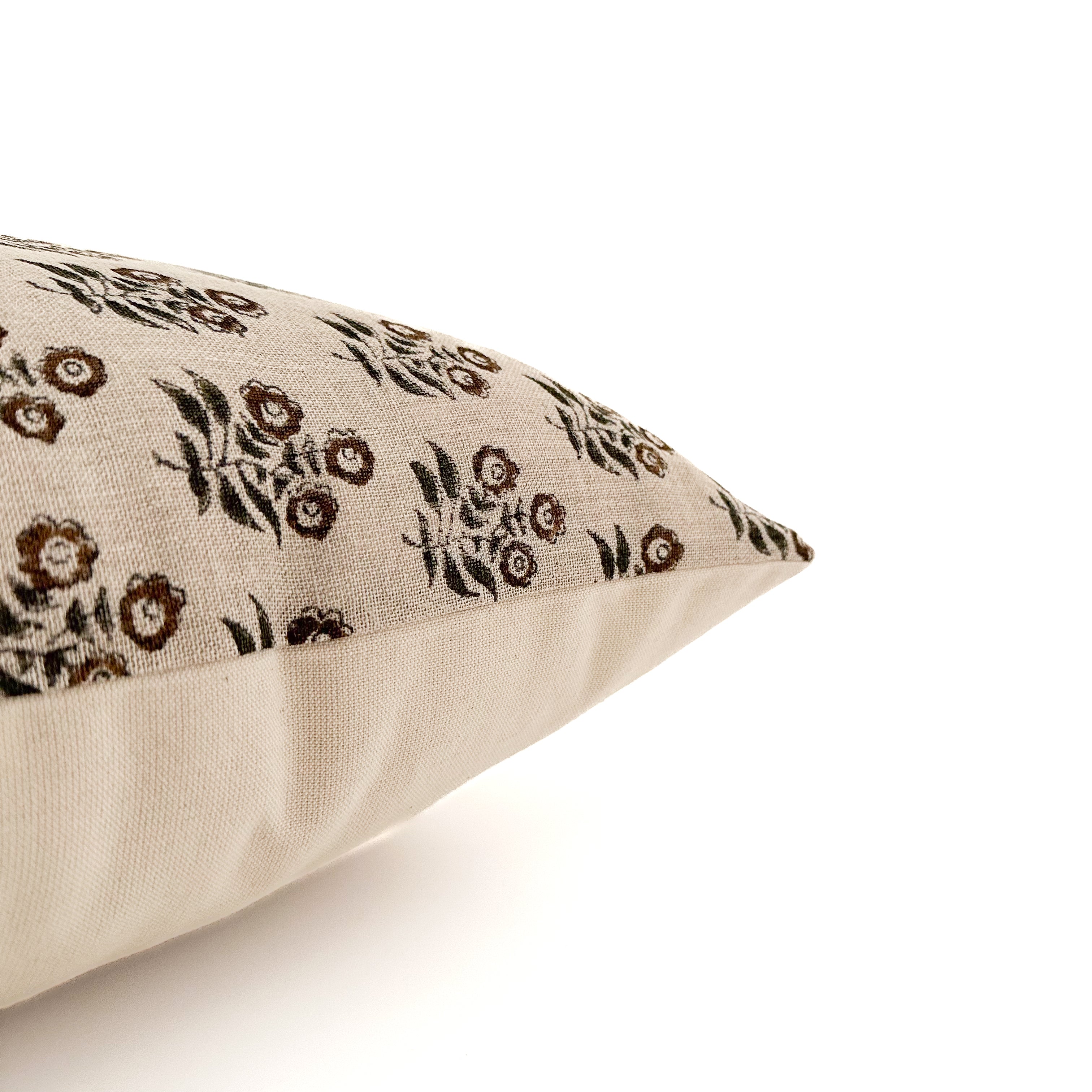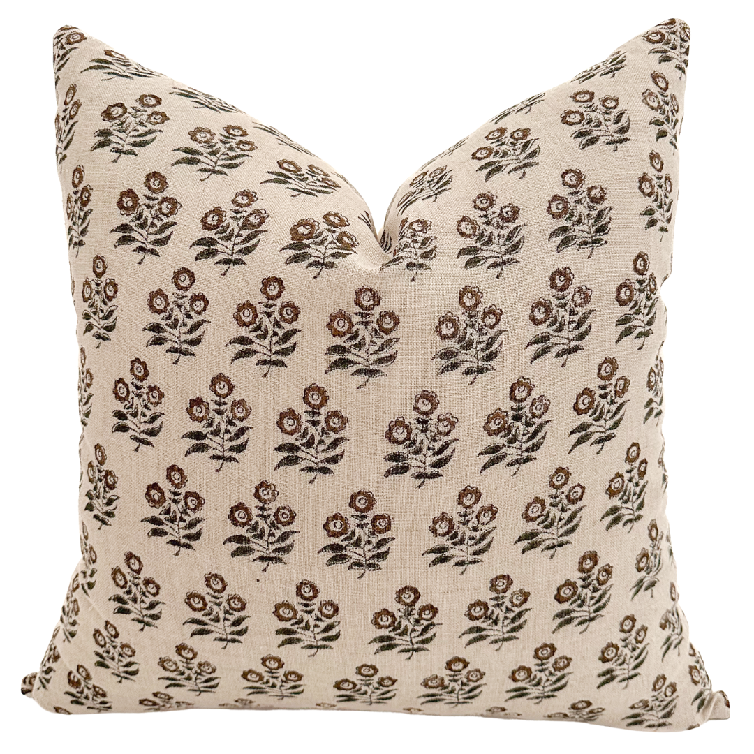Taupe Brown Flower Block Print Pillow Cover offers neutral woven linen fibers and smooth touch. From our block print collection it offers the Wabi Conception of beauty found in perfectly raw state things. It is valued by offering character traits only handmade or well loved over time items can offer. Sold exclusively at Hackner Home. Mix and match with other pillow covers from the shop.