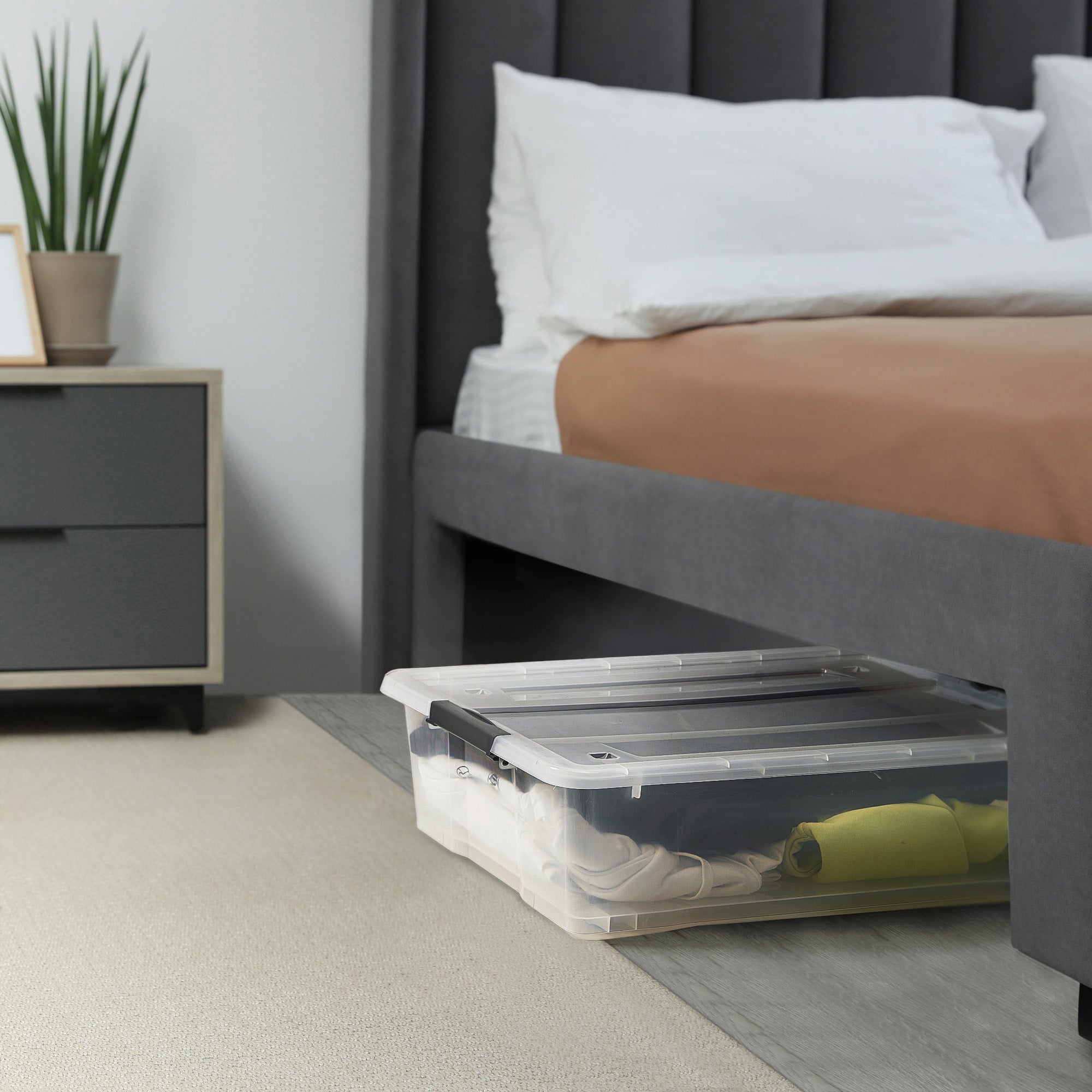 - Not limited to bedroom storage. Keep bins in the bedroom closet, garage, laundry room, or even your office for a touch of organization