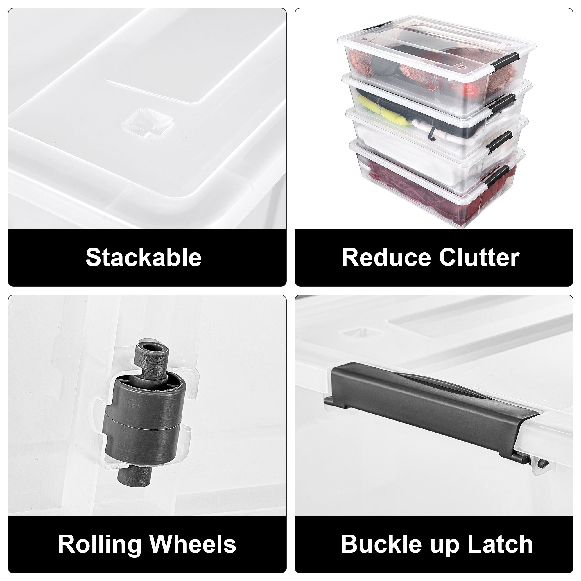 These clear, stackable bins are the perfect solution for maximizing space and keeping clutter away. Whether you’re organizing clothes, shoes, bedding, seasonal items, or holiday decorations, these versatile containers will keep your belongings neatly tucked away. The secure, snap-lock lids shield the contents from dust and debris, while the clear design provides effortless visibility of what’s stored inside. No more digging to find that perfect outfit or cozy blanket!