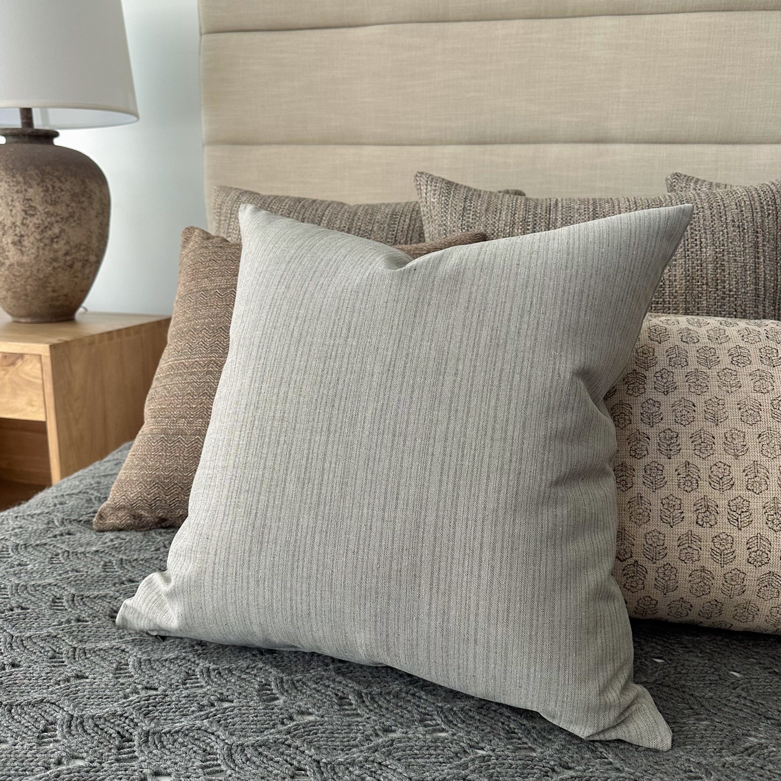 Our Watermark Blue Pillow Cover features a smooth woven fabric with stripe design. Its neutral color gives an elegant look to any space. Mix and match with other pillows of your choosing.